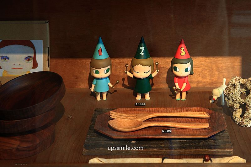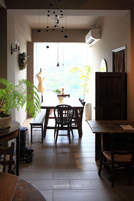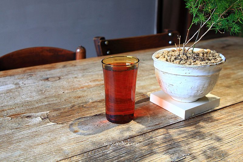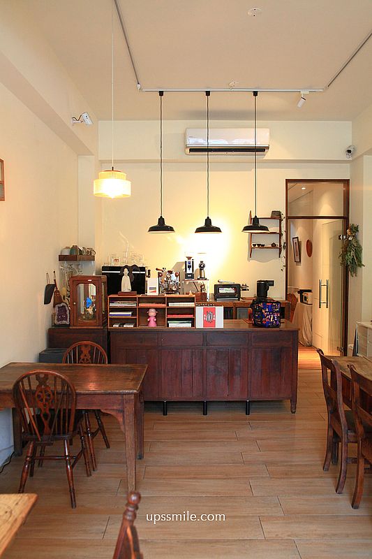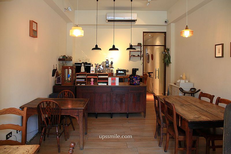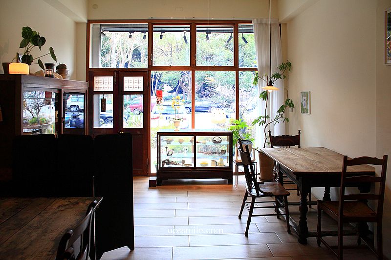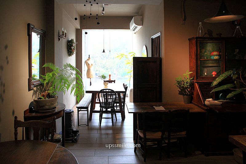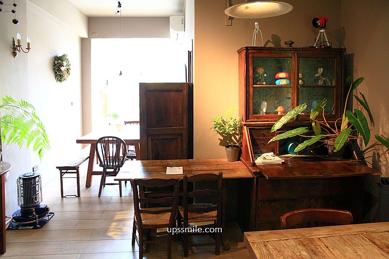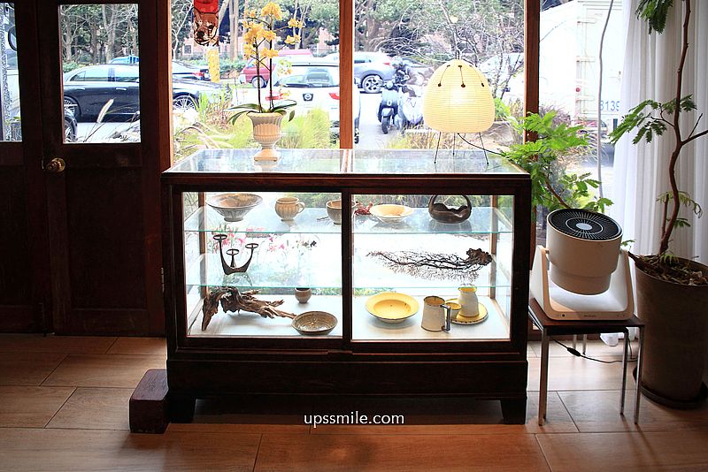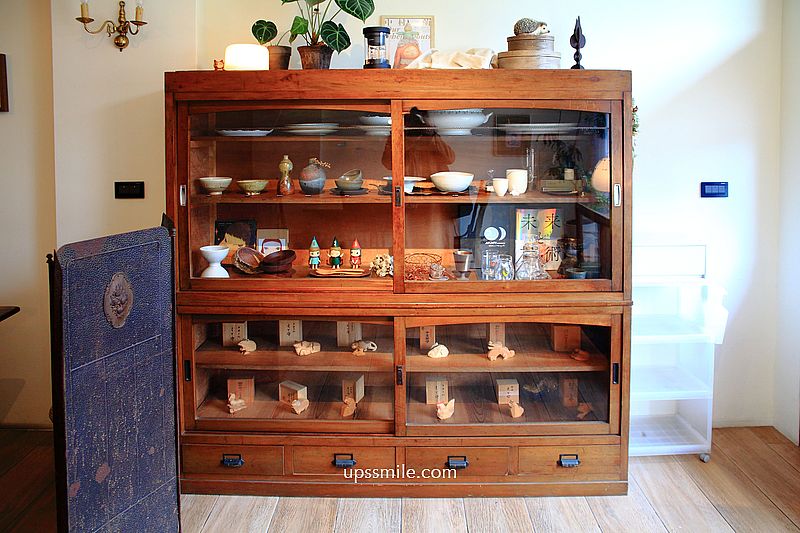 整個木質溫潤傢俱,厚實色,整齊擺放器物,把自然素材與古董的美感傳達出去,這裡複合式經營,提供餐點、古董、咖啡等。