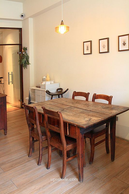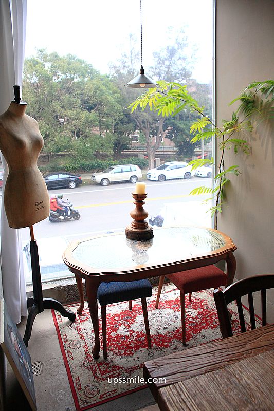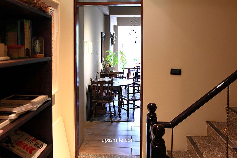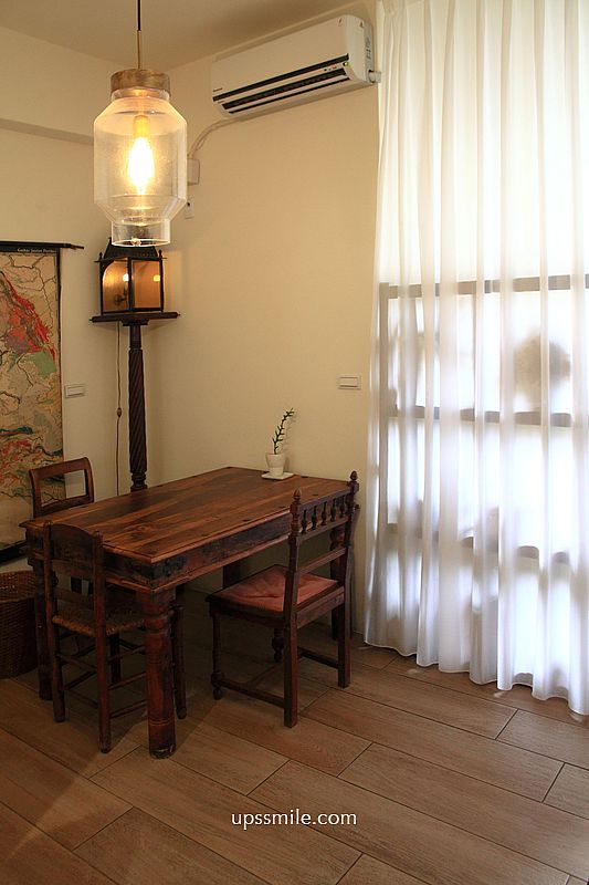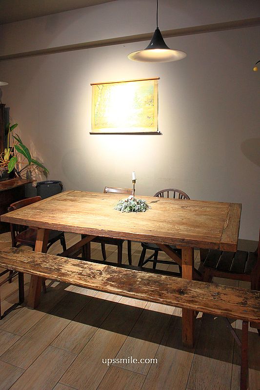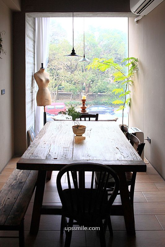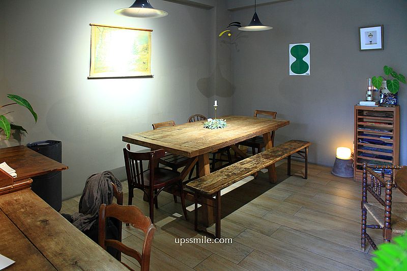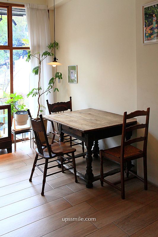 二樓雙人、四人木桌,厚實木桌,大多深色系木頭,古樸樸實,讓人心靈好沈澱,靜謐享受這空間。