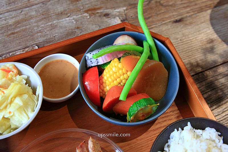 菜色很乾淨,搭配胡麻醬,清爽不膩口,脆甜可口美味。熬煮的蔬菜,有地瓜、馬鈴薯、玉米、蘿蔔等,吃起來無負擔,菜色繽紛多彩,蔬菜單獨吃有自然甜味。