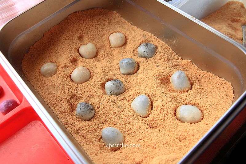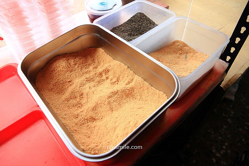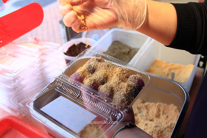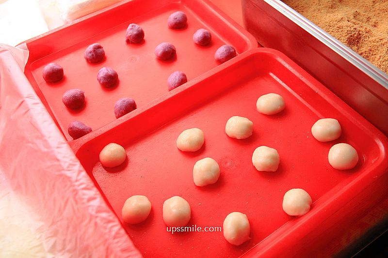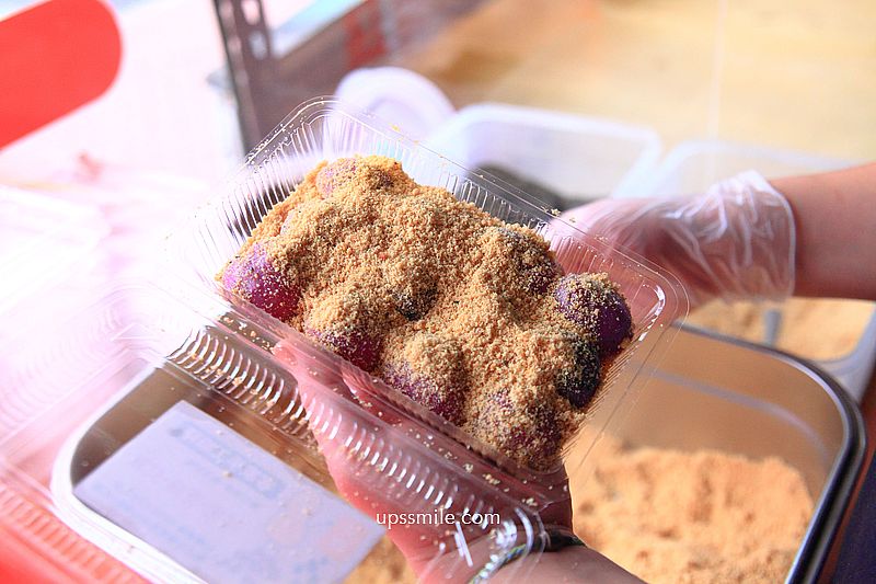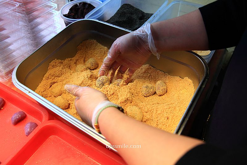 一般來說會在麻糬外層裹上花生粉,如果想拍照的話可請老闆娘不要裹粉,另外附粉。
