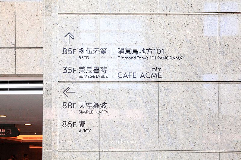 抵達到101大樓辦公大樓信義門,進門後左前方手扶梯旁即是接待櫃檯,天空興波將有專人為您服務,可見一樓大理石牆面上,有幾間吃夯的高空景觀餐廳,像是86樓的饗Joy、85樓的捌伍添第、隨意鳥地方101,還有35樓的Cafe ACME mini咖啡,擄獲網美IG打卡台北景點。