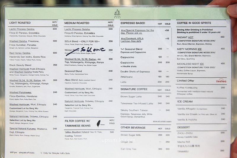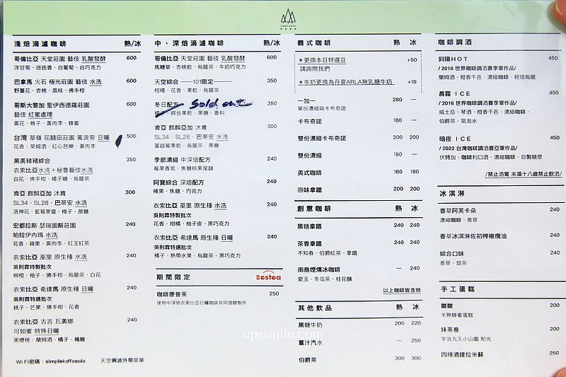 Simple Kaffa Sola天空興波菜單、興波咖啡菜單、興波咖啡101菜單,在一樓就可見菜單,中英文,國際化語言,好點餐,也此,不只有台灣人,也有許多外國觀光客朝聖,最一般座位,每人低消300元,咖啡有義式咖啡、手沖咖啡、創意咖啡、茶飲牛奶汽水、手工蛋糕、輕食沙拉、麵包吐司等鹹食甜點。