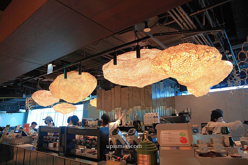 抬頭仰望,宛如蜂巢紙的掛燈,暖黃色光源,多了一種意識型態,打造台北冠軍咖啡廳,台北風格咖啡廳訂位。