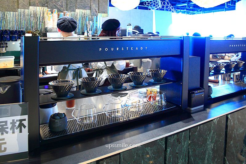 整個曲線吧台,一覽無遺,現咖啡用自動義式咖啡機萃取,把泡茶系統呈現在咖啡上。
