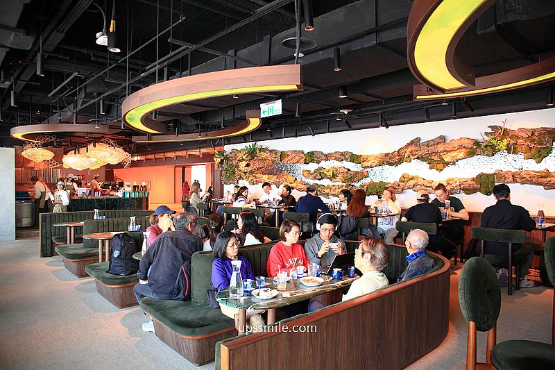 室內用餐空間,分成好幾區,最低消費是觀景座位(窗邊)可容納1-4人,基本消費一桌2000元。而海灣型沙發可容納2-8人,基本消費一桌3000元。一般座位基本消費300元/人,下午尖峰時段只開放現場候位。(接受4人以下候位,5人以上需分桌),一般座位入口處有階梯,輪椅無法入內,請選擇其他桌型,餐飲、咖啡豆、掛耳包都可以列入基本消費(器材類除外)。