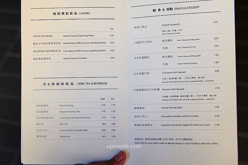 RUFOUS COFFEE ROASTERS 2菜單,低消一杯飲品,提供單品咖啡、義式咖啡、茶、甜點等,一整大頁,從Menu上多達50多種品項可看得出來,單品咖啡豆選擇多,Rufous是台灣咖啡迷與專業人士心中的「必訪名單」。rufous coffee推薦包括:瓜地馬拉咖啡,淺烘焙 Maragogype(馬拉戈吉貝/象豆)、冰滴巴拿馬藝伎(Cold Drip Panama Geisha)以及被網友譽為神級的招牌拿鐵拉花等。