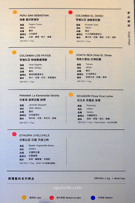 衣索比亞花姬天使之吻250元,紅蜜處理,以茉莉、龍眼蜜、杏桃乾風味為主,喝第一口,中淺烘焙咖啡豆風味,會有點偏花果香,尾韻帶點甜感,用陶瓷杯裝,風味會多層次。