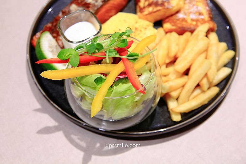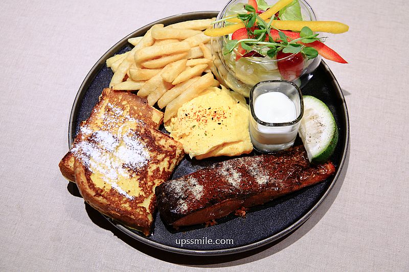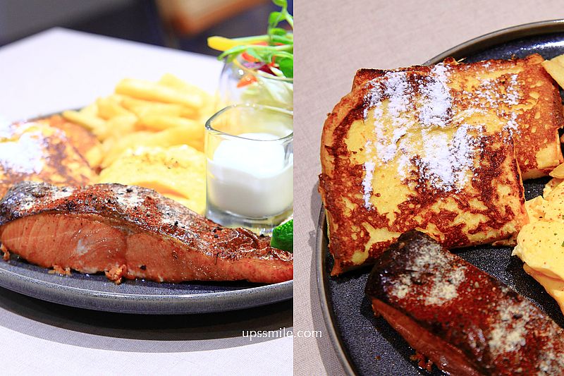鮭魚一整大尾,外層煎至焦香,酥脆粉嫩且誘人色澤,吃下一口鮭魚新鮮細緻肉質,好銷魂。吐司裹上蛋液慢煎,撒上糖霜,法式吐司柔軟帶有奶香,好好吃。