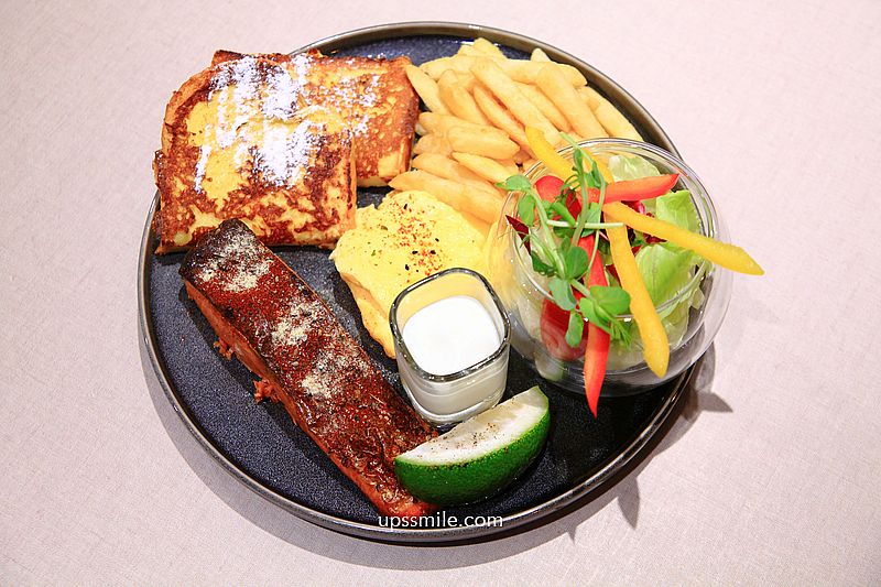 香檸迷迭香鮭魚排菲力540元,有美式嫩蛋、黃金脆薯、烤法式吐司、沙拉、希臘優格,一整盤早餐盤,很豐盛上桌,屬於有魚有法式吐司的早餐盤組合。