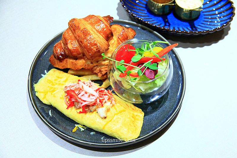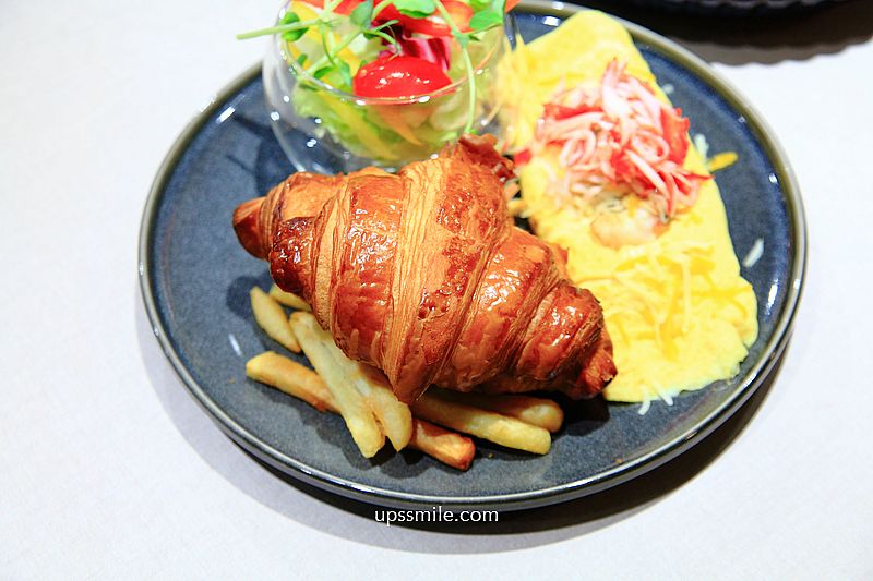 迷迭香檸蟹肉玉子燒歐姆蛋400元,搭配沙拉、可頌、薯條組合,一整盤子餐盤好豐富,光看就胃口大開。