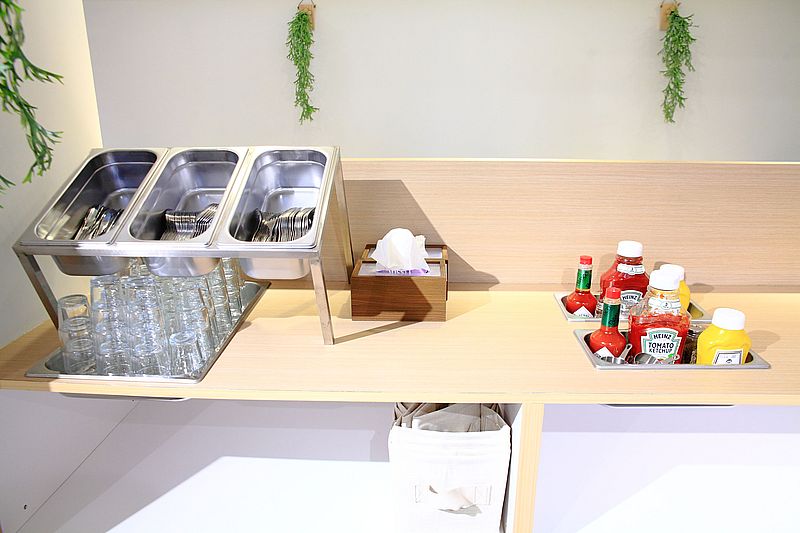 餐具、飲水、醬料、紙巾,在櫃檯旁邊可自助式拿取,整齊規劃在這區,也此,不收服務費。
