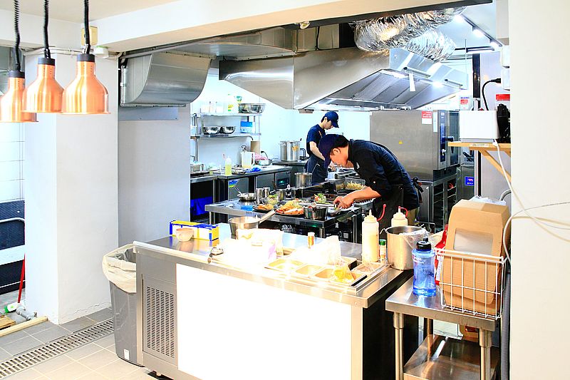 後方可見一整大間開放式廚房,衛生乾淨,讓人食用安心,沒有油煙味,處理排風很好。