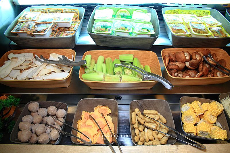火鍋配料,蔬菜盤與火鍋料等可放入火鍋煮,或是用烤來吃,有玉米、甜不辣、香菇、貢丸、蛋餃、水果等,豐富陳列,擺放整齊。