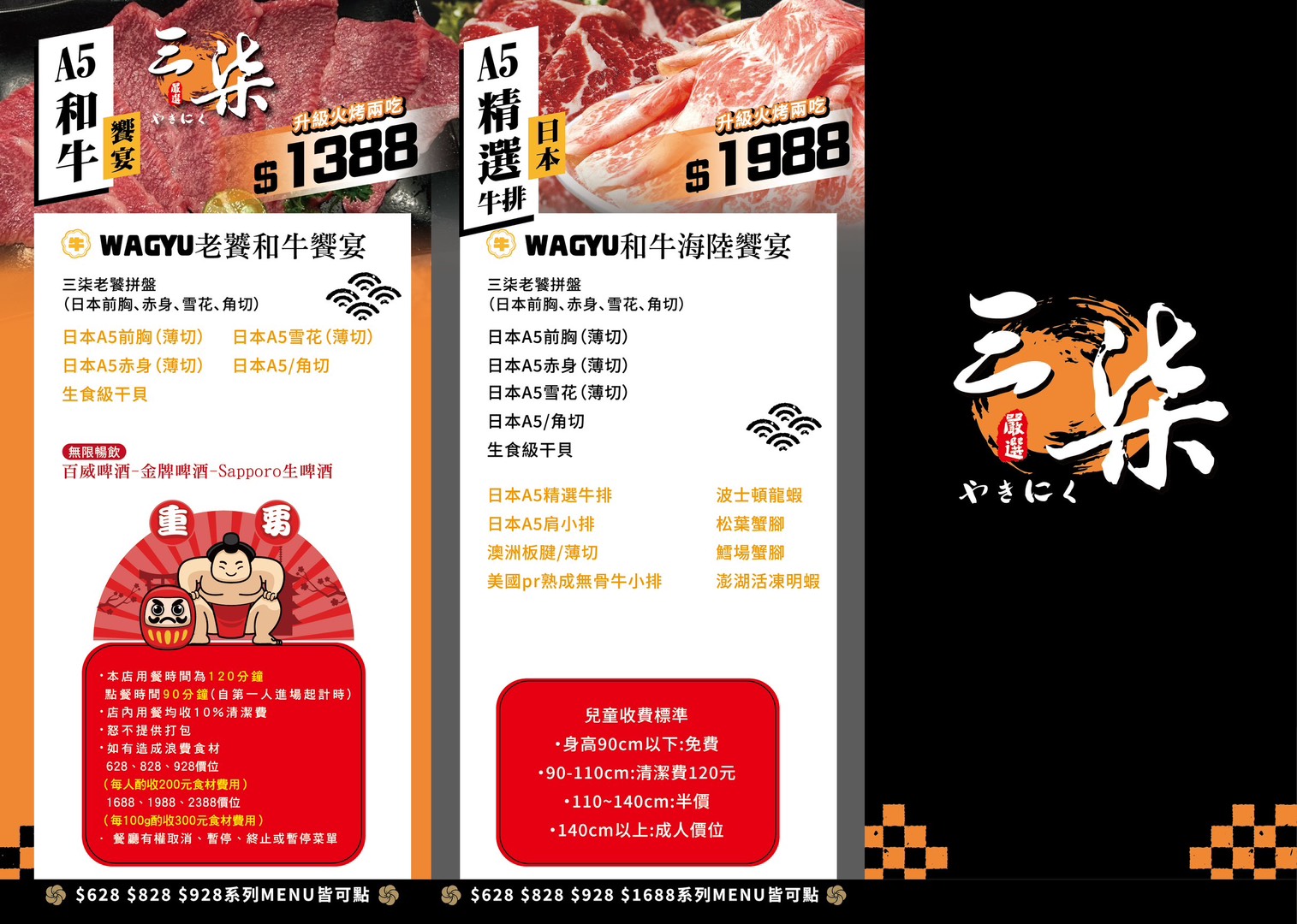 三柒燒肉專門店桃園藝文店菜單、三柒燒肉專門店菜單,燒肉吃到飽推出5款套餐價位,有628元、828元、928元、1388元、1988元,最便宜每人628元頂級燒肉饗宴也很超值,更高檔每人1988元價位的WAGYU和牛海陸等饗宴(和牛、龍蝦、松葉蟹、鱈場蟹通通都有),這天品嚐「奢華燒肉饗宴」928元+39元火鍋,928元套餐+88元享有日本生食級干貝與金牌-百威無限暢飲,會酌收10%服務費,火烤兩吃吃到飽。