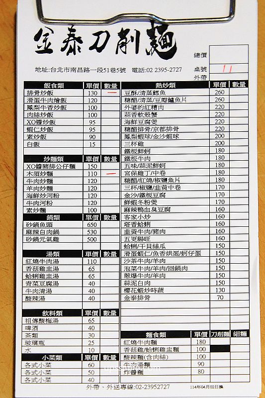 金泰刀削小廚菜單