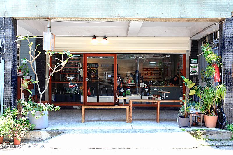 門口提供戶外等候區,若天氣不熱,座落這裡喝一杯,很不賴,兩邊擺放綠色植栽,少了些冰冷感。