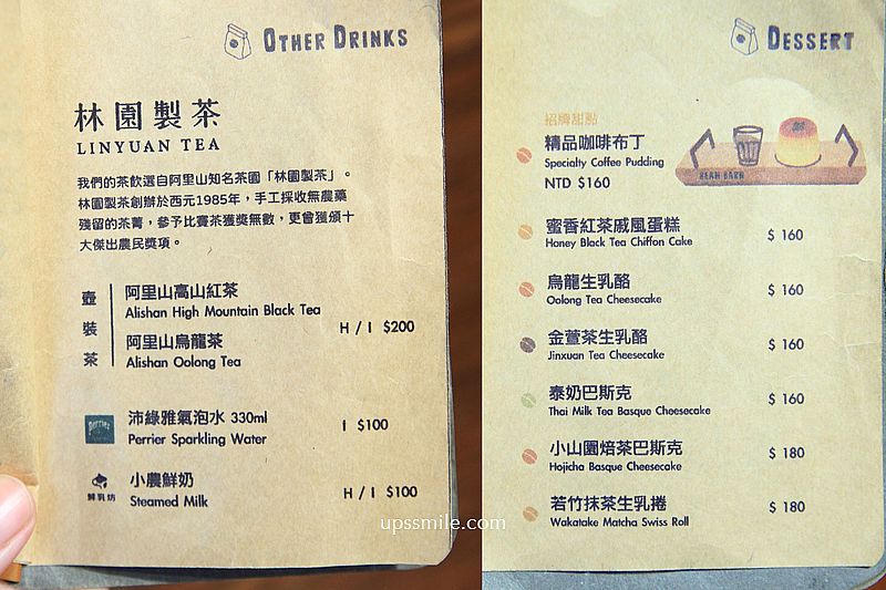 BEAN BARN豆荒良倉菜單,設計小巧可愛,掛在吧檯角落下方,用濾掛包與菜單結合,提供單品咖啡、拿鐵、茶、甜點等,內用低消一杯飲品,客滿限2小時。