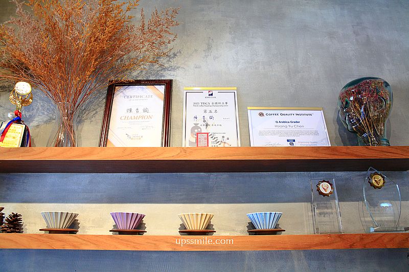 靠牆面高腳椅,木質桌面,上方放滿了濾掛杯陳列,榮譽勛章,感受這自家烘焙的實力。