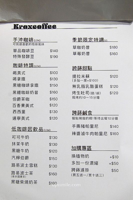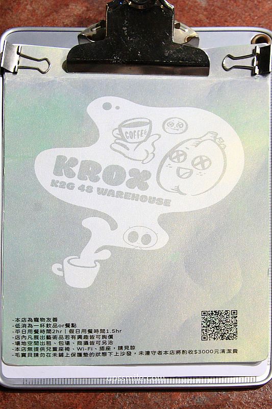 KroX Coffee菜單、K2G 48 Warehouse菜單,低消一杯飲品或餐點,沒限制一定要飲料,平日限2小時,假日1.5小時,提供輕食鹹食、咖啡、茶、甜點等。