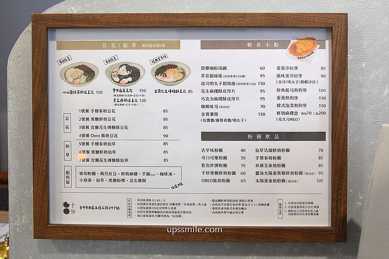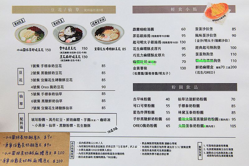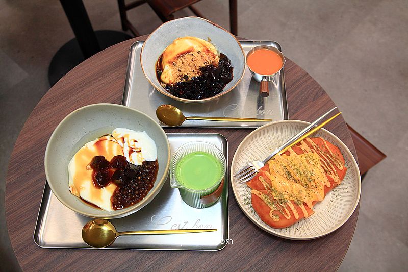 c’est bon十分粉圓菜單,內用低消每人85元,客滿限90分鐘,銅板美食到百元美食,提供鹹食、甜點、飲品等,主打豆花專賣店,台中甜品推薦。