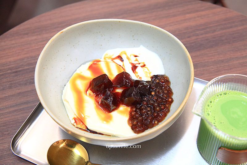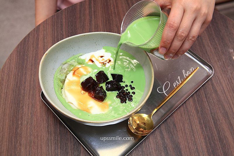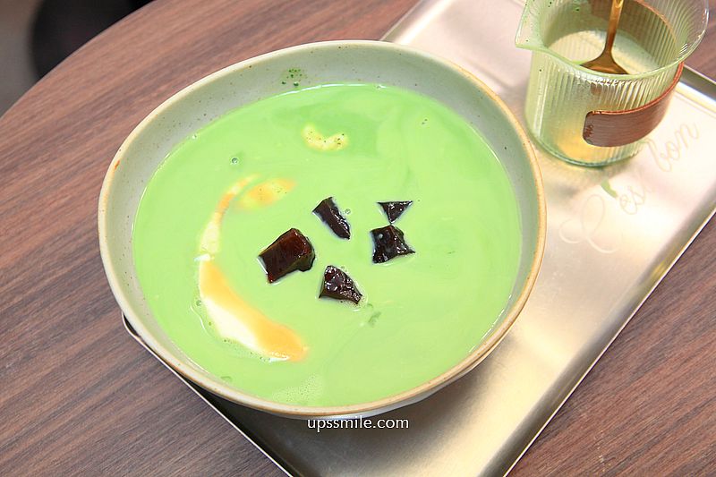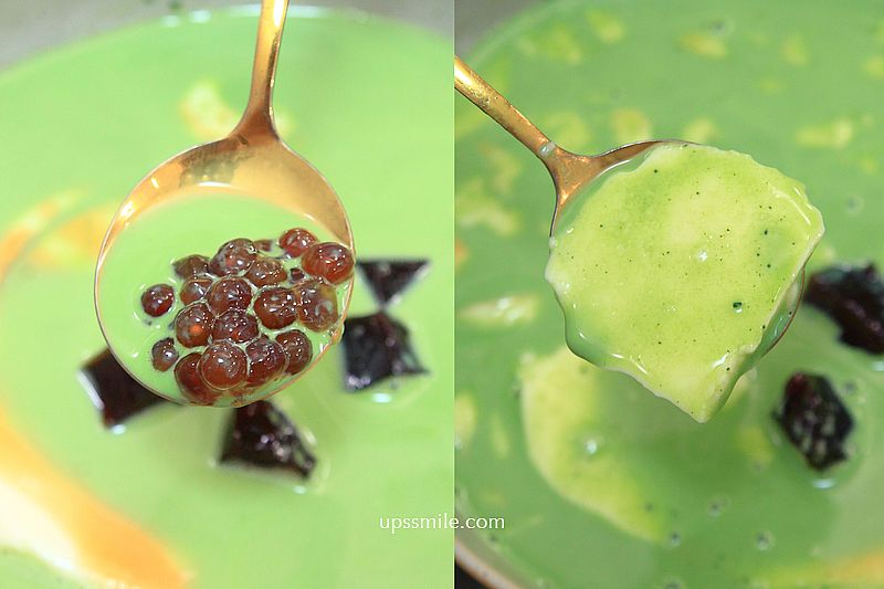 小山園抹茶那堤豆花,配料搭配琥珀粉圓、鮮奶麻糬、黑糖粉粿,小山園抹茶香氣濃郁,那抹綠,令人食指大動。