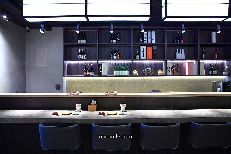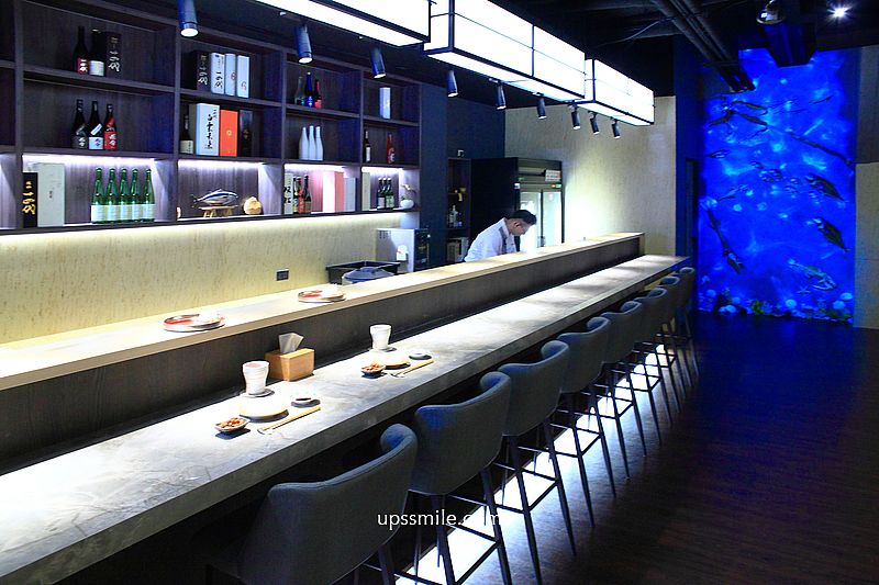 映入眼簾,跳脫傳統日料日式用餐氛圍,裝潢低調優雅,搭配海洋意象投影,一整面藍色水影牆,沉浸式日料體驗,這裡以高腳椅座位,西式吧台餐桌美學,藍色大海元素主題,營造大海中的日式氛圍,讓人好喜歡。