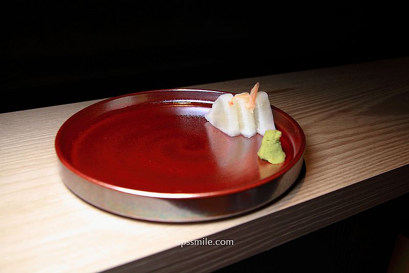 餐盤前方,擺放一整大塊宛如山形造型的醃蘿蔔,蘿蔔實在很脆甜開胃,讓胃口打開,以及一小坨的日本山葵醬,搭配生魚片與海鮮食用,感受這細節。