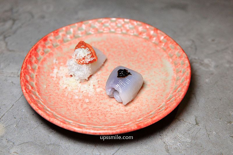 澎湖花枝,當季盛產,花枝手切呈現,使用海苔醬與白起司絲,撒上松露鹽,一口吃下,花枝細膩綿滑,如同奶酪的海味,鹹香鮮美,另款搭配北海道海膽,濃郁鮮美。