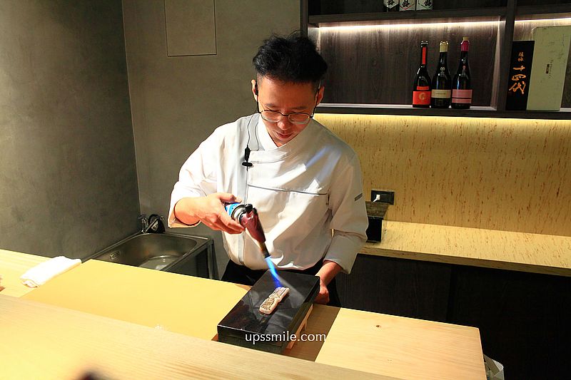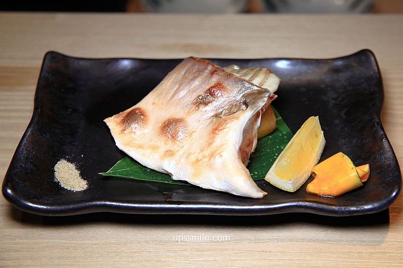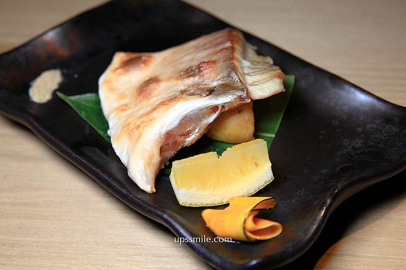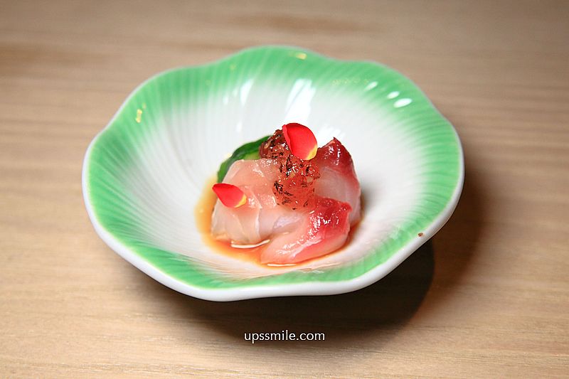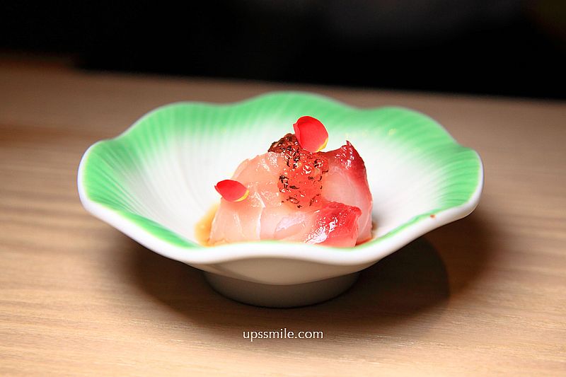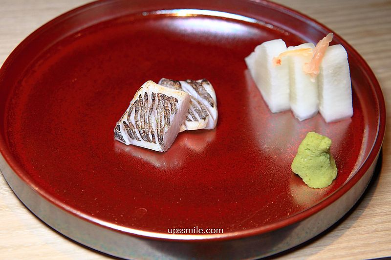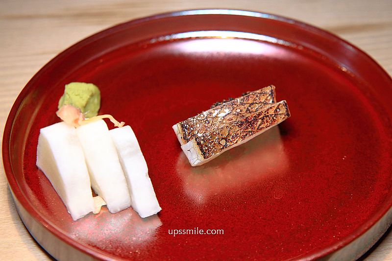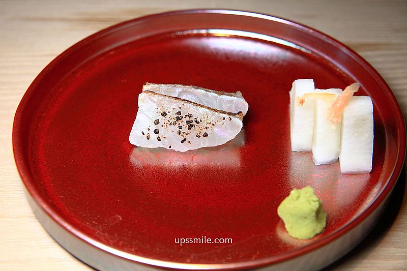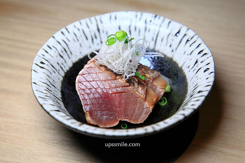 三點鰹,又有三點仔稱,使用蘿蔔絲可提味,去腥解膩,脆口的蘿蔔甜香,這款魚鐵質含量高於種,魚肉紅潤色澤,吃下一口,採用稻草煙燻料理手法,多了特殊香氣,炙燒處理會帶出煙燻香與油脂層次,焦香味濃郁,入口即化,宛如吃肉的豐富層次,清爽又鮮甜。
