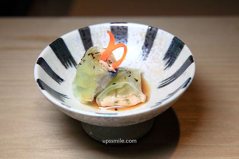 日本兵庫縣生蠔,使用檸檬凍與水果綠葡萄包覆,整個生食等級的生蠔,沒有腥味,滑進嘴裡直接爆汁,綠葡萄的甜香,果肉肉汁,搭配檸檬凍的酸,晶瑩剔透外觀,炎炎夏日,消暑開胃,鮮味濃郁且不腥,生蠔可吃到細膩且伴隨肥美鮮嫩口感。