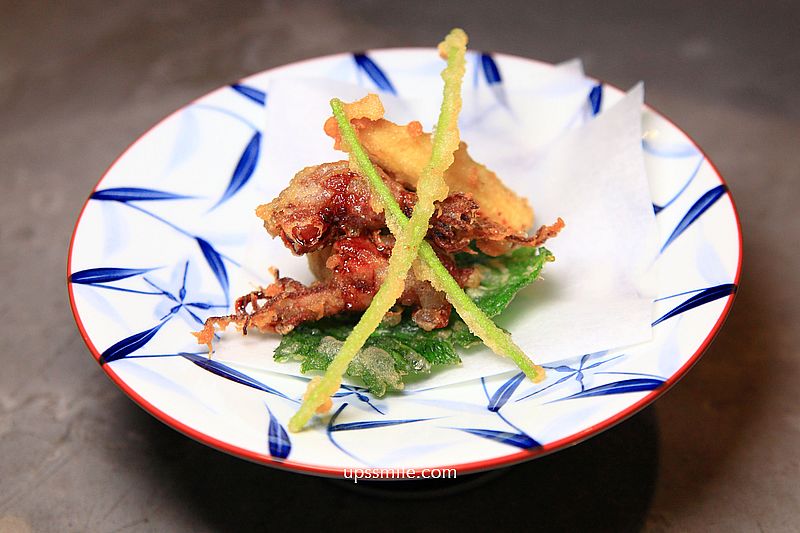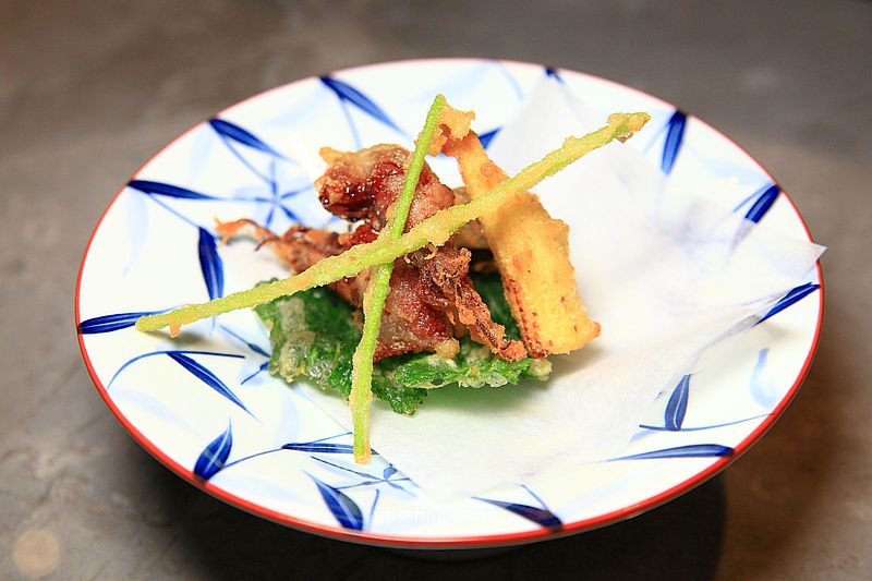 炸天婦羅,來自日本富山灣烏賊,又被叫做瑩光烏賊,屬於季節限定特產,有「深海藍寶石」美譽,小巧的瑩烏賊,很高檔,日本海所有海域都有螢烏賊棲息,被沖上岸與受到刺激的螢光烏賊使出渾身之力散發出藍光,很珍貴的魚種,很常見料理成螢烏賊與醋味噌作法,這裡用三葉菜裏上薄粉油炸,脆口酥香,不油膩,滑嫩甘甜的海味在口中散開。