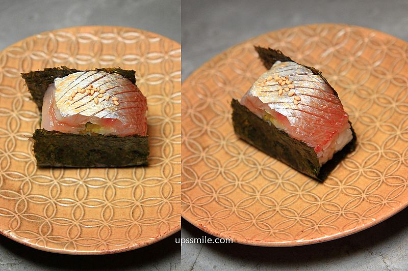 赤鯮魚壽司,日本高級料亭限定常可見的魚種,很有創意組合,使用春子鯛配海苔、紫蘇葉、東京蘿蔔條,成為創意壽司吃法,很有梗,好霸氣呈現壽司作法,高級燒烤魚種的赤鯮,魚肉細緻,簡單的燒烤或乾煎就很好吃,鮮美軟嫩,搭配脆口的鹹香海苔,兩種組合,無比幸福。