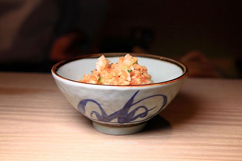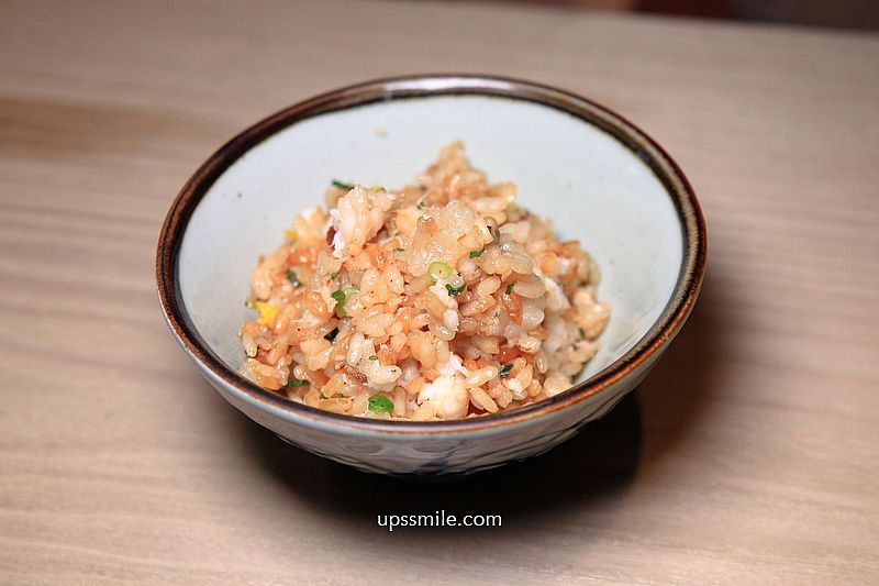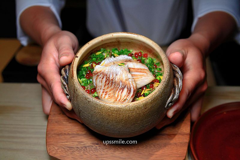 盤仔魚釜飯,又叫飯鯛釜飯,用陶鍋器具盡現大氣,打開冒出熱氣,使用越光米、醬油、鮭魚卵來提鹹香,看似普通的米飯卻不平凡,主廚自己醃製的鮭魚卵與蔥花,更透露出師傅的拿手絕技,雕魚肉質細嫩,焦香釜飯底部鍋巴酥脆,越光米飽滿米粒,好米香,魚卵的鹹,把米飯多了鹹度,吃完不夠,還可續,讓你有飽足感。
