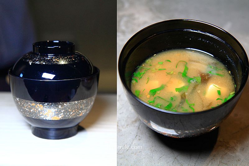 味噌湯,味噌湯是一種湯料理,即麵豉湯,是日本具代表性的傳統食品,常見於日本人早餐,雖然是同樣的海帶、魚乾、味噌三種材料,但因為各家庭所使用的方法及時間的不同,家家有不同的味噌湯作法,這裡使用三種味噌煮湯,有紅味噌、信州味噌、白味噌組合,一般味噌湯都很死鹹,用米泡的煮湯作法,這裡不馬虎,用魚肉細敖慢煮,柴魚昆布高湯清澈回甘,搭配海帶與豆腐,豐富配料,暖胃好喝。