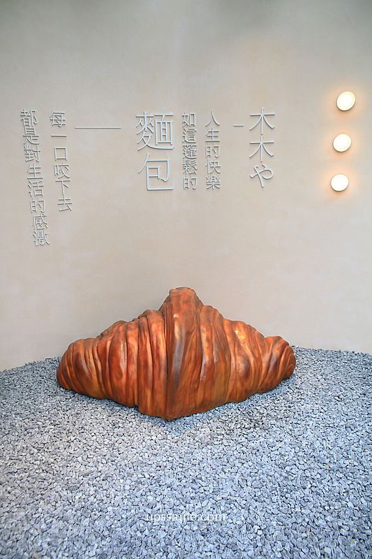 木木や烘焙早午餐戶外庭院造景,鋪上小石頭,設計一網美打卡牆,奶油色背板,放上中英文圖樣,一整個巨無霸大的可頌,人可站在一旁拍照打卡,一旁桌上還有小可頌,可拿取拍攝,好好玩。