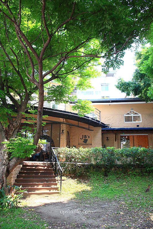 隨著水泥階梯,慢慢走到大門,戶外庭院很寬敞,綠意盎然植栽,打造天母庭院咖啡廳氛圍。