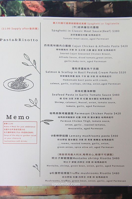 羅勒青醬鮭魚干貝麵520元,義大利麵11點後才開始供應,10點多到,願意等,想吃義大利麵,這天沒吃早餐盤,用新鮮羅勒青醬、鮭魚、干貝、蝦、洋蔥、蒜、帕瑪森起司組成,一上桌光看義大利麵份量有驚人,份量多,用料實在,選擇寬麵,但上桌看起來想是圓麵條。