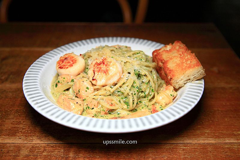 麵條吸附羅勒風味,味道很香濃,義大利麵份量真是好多,吃完超飽足感,麵條吸附醬汁,很羅勒香氣,干貝與鮭魚好多,下重本,最鮮明的滋味當屬日本進口的生食級干貝,新鮮度滿分,即使變涼後也仍保有符合期待的美味標準,海洋風味,海鮮處理得很好,好吃有水準,可惜羅勒義大利麵吃多,會有點膩口,適合多人分食。