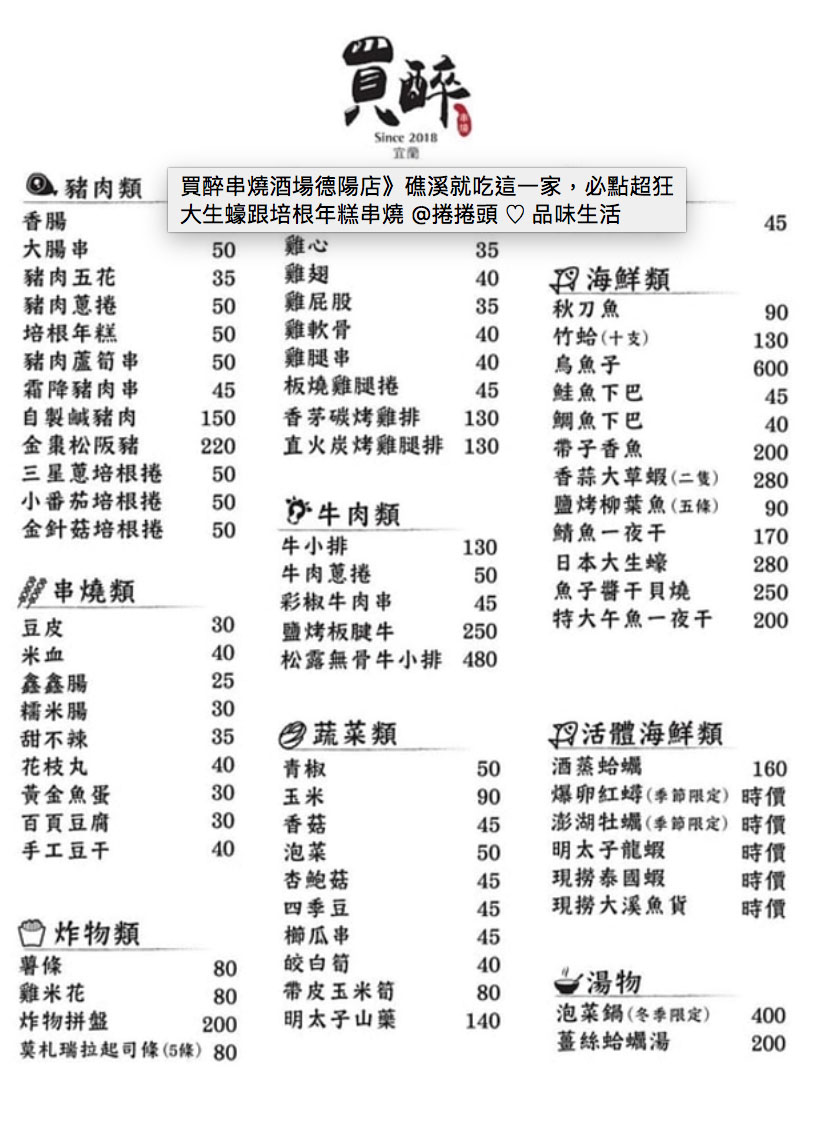 宜蘭美食景點推薦,宜蘭礁溪美食,礁溪串燒推薦,宜蘭晚餐宵夜推薦,買醉串燒酒場德陽店位於宜蘭縣礁溪鄉德陽路51號,超人氣串燒排對名店,生意超好,可內用,可外帶,推出路邊烤肉攤價位,銅板美食,CP值高且吃得飽,買醉絕對是礁溪晚餐宵夜首選,從肉品到海鮮通通有,超過50種多種食材與大溪漁港現撈海鮮,愛小酌老饕可輕鬆點起來,店內特定幾天會有駐唱歌手演唱,礁溪燒烤串燒好銷魂,礁溪居酒屋食尚玩家推薦,附買醉串燒酒場德陽店菜單、買醉串燒菜單。