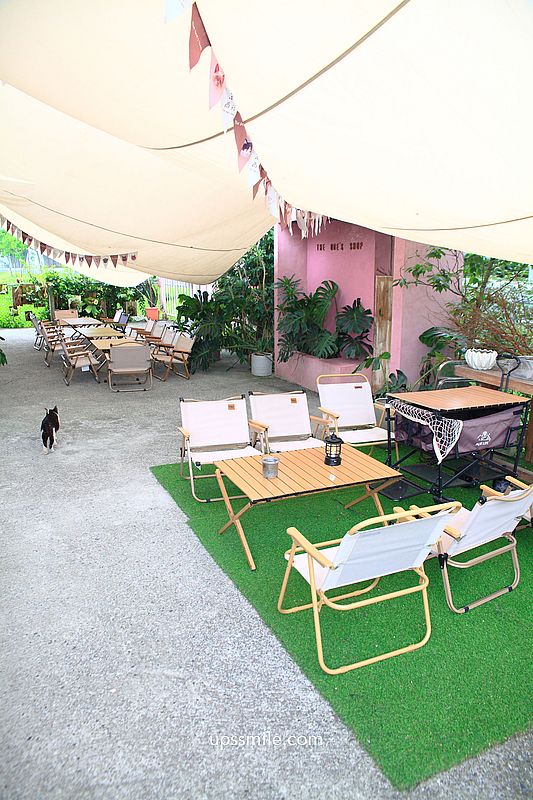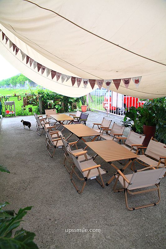 門口庭院,擺放大量露營椅,打造露營風,鋪上綠色地墊,營造一種野餐氣息。