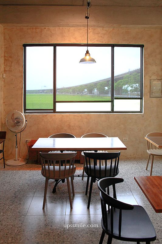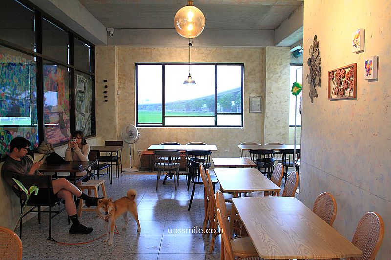 宜蘭傳統老宅,傳統復古風台灣花磚,貓咪在店內跑來跑去,工業風氛圍,分成好幾區空間,大片窗景,採光明亮,可見外頭一整片稻田,田園景色美好。