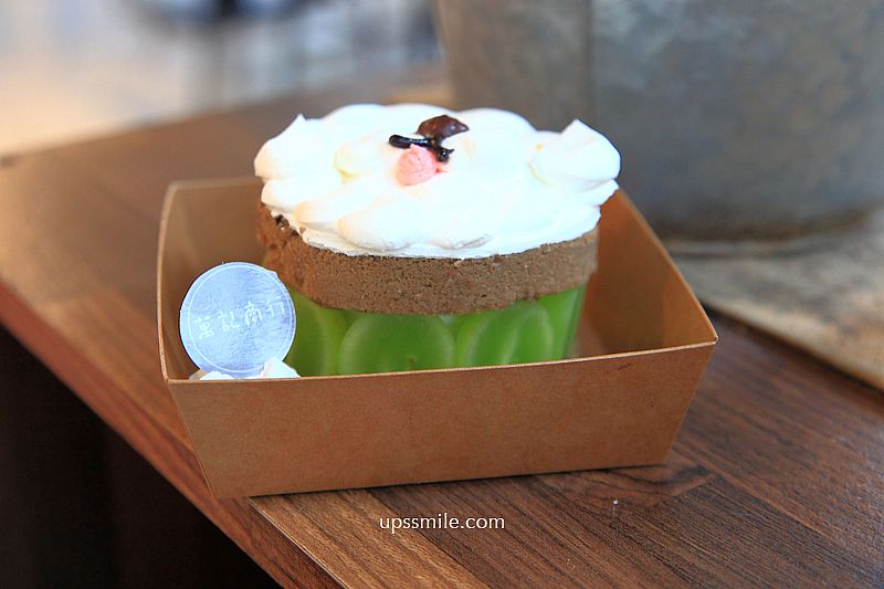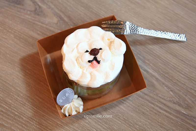 甜點造型蛋糕,店家手作甜點,很有梗,這款麝香葡萄焙茶戚風蛋糕(比熊造型甜點)155元,走可愛的比熊造型,走療癒性甜點,上頭一整層白色鮮奶油,紙盒裝,很逗趣可愛。