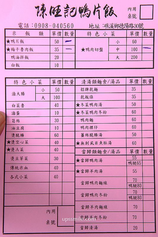 陳旺記鴨片飯的菜單,分成內用與外帶美食,菜單有分,銅板美食價格,必吃鴉片飯50元、梅干魯肉飯35元、鴨肉切盤中份100元,提供米飯、鴨肉切盤、特色小菜、清湯類、當歸湯等,小菜或推薦前方會標註上星星推薦。