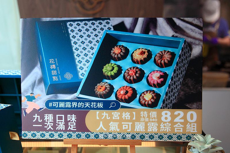 愛吃可麗露的老饕吃起來,可麗露界天花板稱號,台北可麗露專賣店,士林天母伴手禮可麗露排隊名店,花磚甜點位於台北市士林區忠誠路二段154巷7號1樓,巷弄美食,有台灣特色花磚紙盒包裝禮盒,推出招牌人氣經典九宮格可麗露綜合組,也可單一購買或花磚甜點四宮格裝可麗露禮盒,自家食用或送禮都好推薦,點了百香果口味可麗露、經典原味可麗露、抹茶口味可麗露、焦糖口味可麗露、紅心芭樂可麗露,焦脆外皮、Q軟內餡可麗露,每款可麗露口味特色且好吃,台北伴手禮推薦,附花磚甜點菜單。