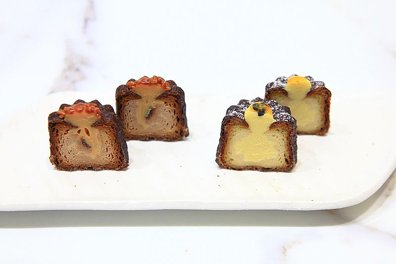 焦糖口味可麗露,焦糖略帶甜感,焦糖香氣,厚實甜香。百香果口味可麗露,百香果味道很濃,就像是吃百香果果實,酸甜層次,清爽層次,好適合悶熱的夏天品嚐。