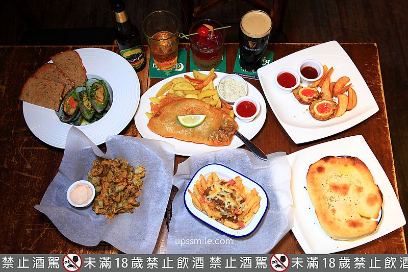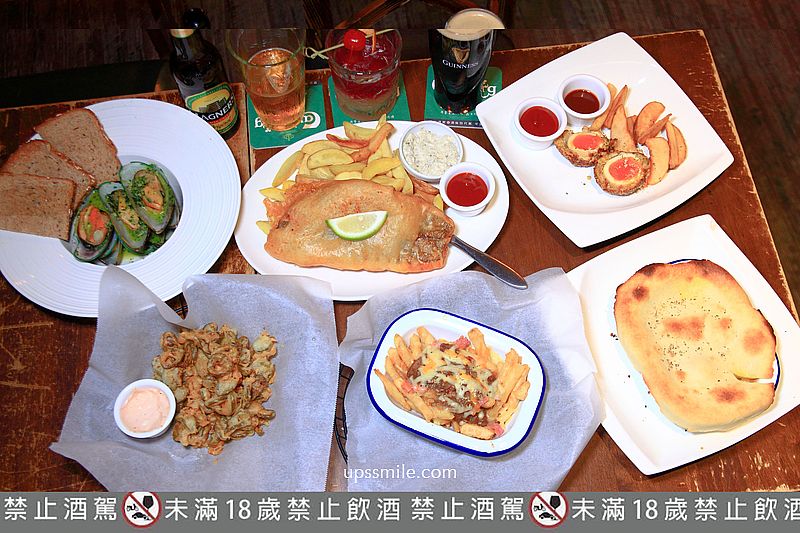 The 41 Bistro 英式餐酒館永和店菜單,點了一整桌,咖哩雞肉派300元、蘇格蘭蛋260元、炸魚薯條490元、洋蔥醬肉汁薯條220元、炸墨西哥辣椒圈150元、蒜香香草奶油淡菜550元、健力士黑啤酒Guinness 250元、紐約酸酒320元、邁格士蘋果酒230元,好吃餐點,有一定水準。