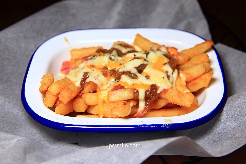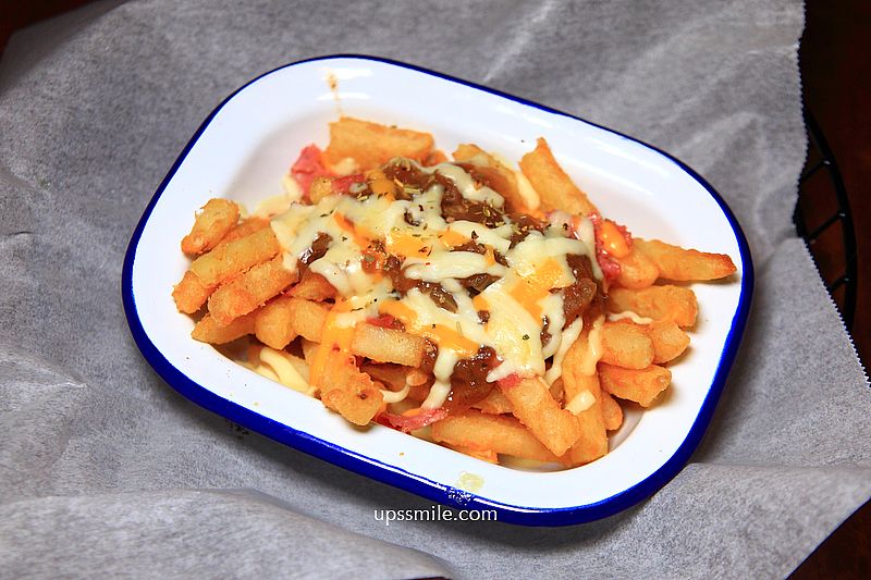 洋蔥醬肉汁薯條220元,熱騰騰上桌,得小心燙手,使用脆薯淋上特製洋蔥醬搭配臘腸,加入起士焗烤,造就薯條另一層次吃法,薯條鹹香入味,下酒好對味。