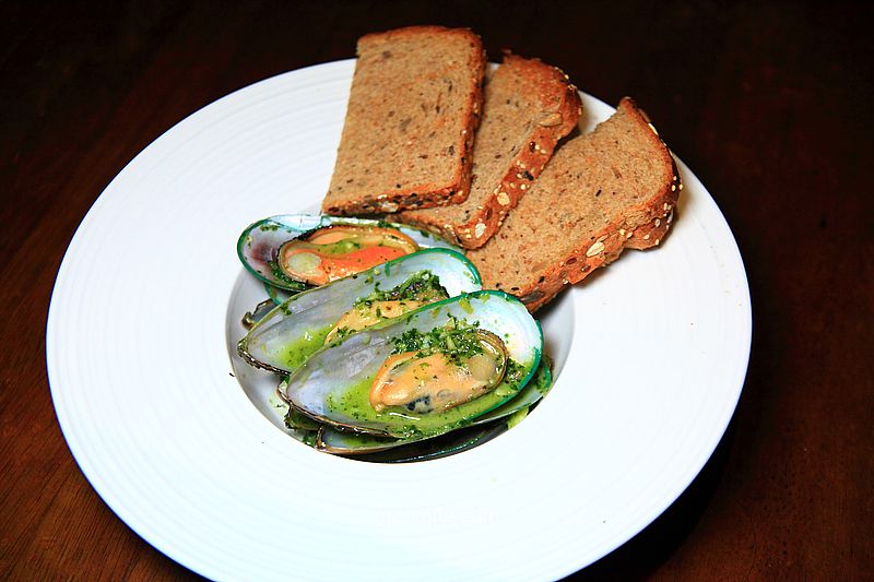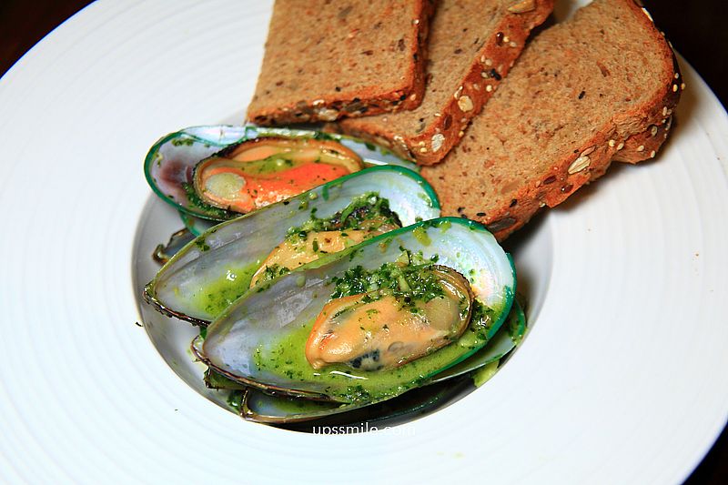 蒜香香草奶油淡菜550元,嚴選紐西蘭淡菜搭配特製香草大蒜奶油,淡菜搭配蒜味處理,滿滿蒜香,實在好鮮味,搭配歐式麵包一起吃,增添豐富層次。