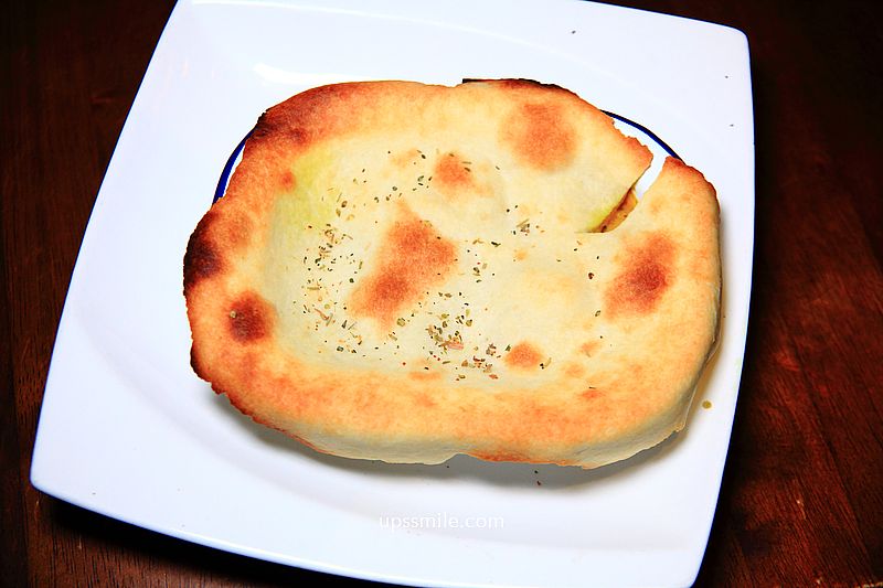 咖哩雞肉派300元,一整大片店家手作烤餅,從麵糰開始,一整層烤餅走酥脆外衣路線,建議切下沾著下方的咖哩醬一起吃。