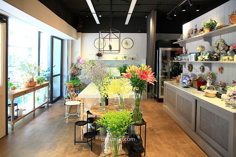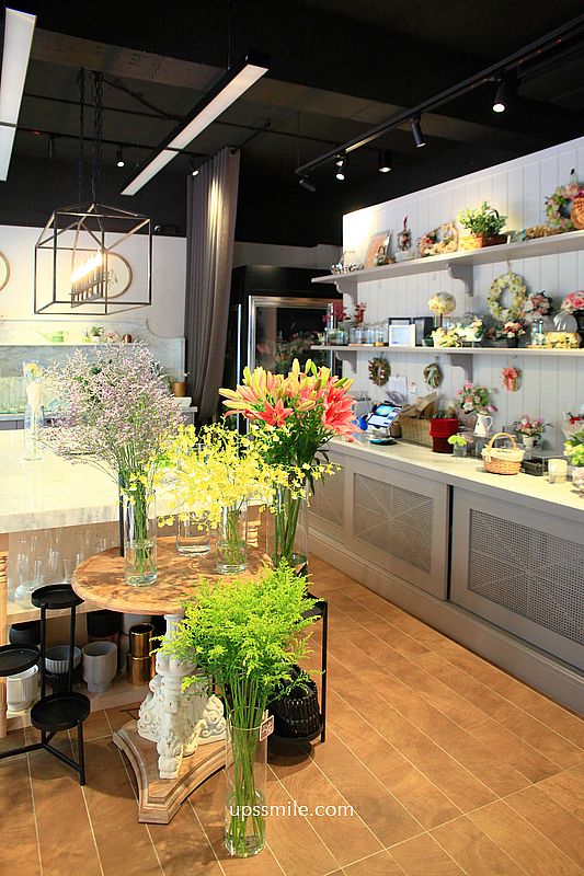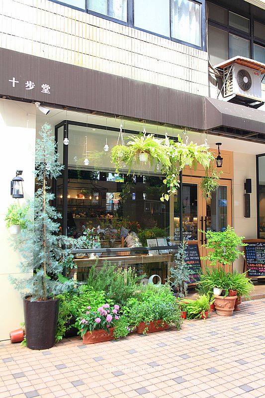 映入眼簾,十步堂分成左右兩區空間,純白混搭鄉村風裝潢氛圍,典雅大器,左手邊規劃花藝植栽等陳列,可訂購花藝等植栽,右手邊是提供休憩吃美食的空間。
